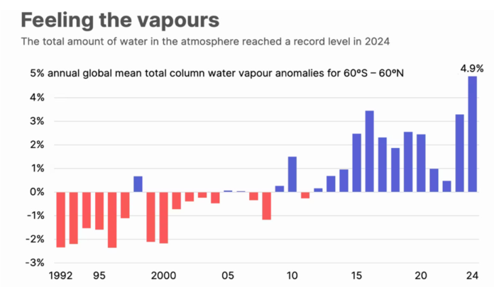 Near-global (60°N-60°S) amount of moisture (water vapor) in the atmosphere, based on ECMWF ERA5 analyses