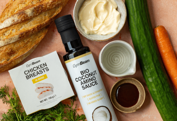 Drain the canned chicken breast, break it apart with a fork, and season with coconut amino sauce and sweet chilli sauce. Cut the baguette lengthwise (but don’t cut it completely through), spread both inner sides with mayonnaise, fill with pickled vegetables, chicken and herbs. Cut the filled baguette crosswise into 2 equal halves for easier eating and serve.