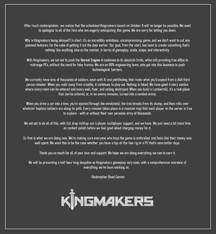 A statement posted by the developers of Kingmakers announcing that the game is delayed