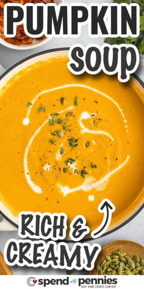 This easy pumpkin soup is made with chicken broth, pumpkin, bacon, and warm spices, then blended with cream until silky smooth.