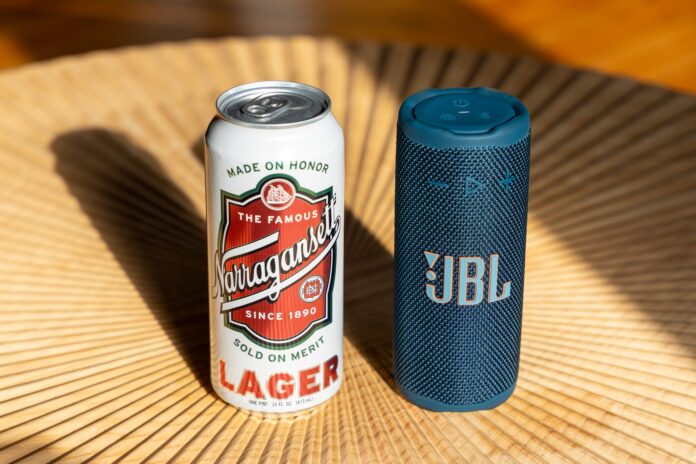 When I first saw JBL’s Grip, I dubbed it the “tall boy of Bluetooth speakers,” and now, having held the Grip in my hand and having laid eyes on it for myself… I stand by that claim. The Grip is all about the size, which in this case, is similar to a “can of seltzer” according to JBL, or if you’re a hoodlum like me, then a tall boy. For proof of its tall boy-ness, I put the Grip side-by-side with a can that equals one pint. Here’s the Grip next to a Narragansett for your viewing pleasure: