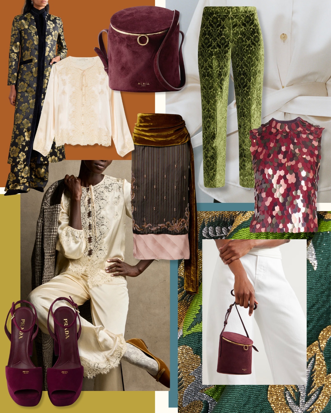 This season’s moodboard brims with energy: silks and satins that flow with movement, sequins that catch the light, and velvets with a deep, dramatic richness. Moody florals and lace bring a romantic touch, while suede and leather ground the palette with texture and balance. Embellished coats add a statement-making layer, while sculptural bags and simple flats bring striking dimension. Each element stands out on its own yet comes together in my early season planning, shaping a wardrobe that embraces autumn’s darker tones and the spirit of what lies ahead.