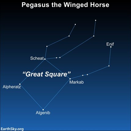 The “Great square of Pegasus” is an easily recognisable asterism within this constellation and can be used to help spot Pegasus. An asterism is a prominent star pattern, part of a constellation. This asterism forms the torso of Pegasus and is made up of four bright stars. The first three stars are from Pegasus, Alpha Pegasi (Markab), Beta Pegasi (Scheat) and Gamma Pegasi (Algenib). The last star is now considered to be part of the constellation Andromeda; this star is called Alpha Andromedae and even though it is from another constellation it is still a part of the asterism and is still known as the belly button of the horse.