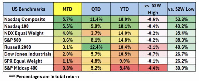 “Every bull market climbs its own wall of worries” is an old Wall Street adage that may never be more apropos than what we are witnessing this year. The list of market concerns in 2025 has been extensive, and growing, starting with tariffs and trade wars, rising geopolitical tensions, inflation, policy uncertainty, social unrest, cracks in the labor market, soft housing data, and as of today a government shutdown. Yet despite extreme volatility in the Spring accompanied by size drawdowns of 20% for the S&P 500, 25% for the Nasdaq 100, and 30% for the Russell 2000, the stock market has stormed back to record highs with healthy breadth and cyclical leadership.