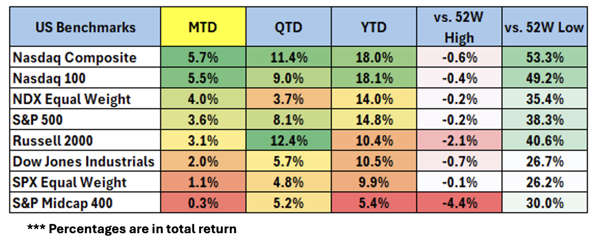 The broad U.S. equity indices were higher across the board in both September and Q3. For the S&P 500 and Nasdaq-100, September marked their 5th and 6th consecutive monthly gains, respectively. And for the S&P 500, this was its 2nd best September (+3.6%) in 27 years.