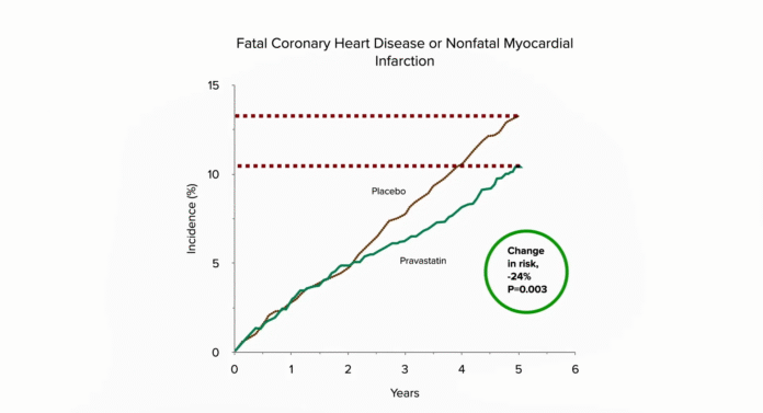 The use of relative risk stats to inflate the benefits and absolute risk stats to downplay any side effects has been referred to as “statistical deception.” To see how one might spin a study to accomplish this, let’s look at an example. As you can see below and at 1:49 in my video, The True Benefits vs. Side Effects of Statins, there is a significantly lower risk of the incidence of heart attack over five years in study participants randomized to a placebo compared to those getting the drug. If you wanted statins to sound good, you’d use the relative risk reduction (24 percent lower risk). If you wanted statins to sound bad, you’d use the absolute risk reduction (3 percent fewer heart attacks).