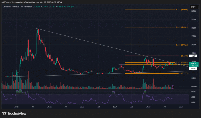 For five years, the ADA price has compressed within a triangle channel, which could fuel further upside in case of a bullish breakout.