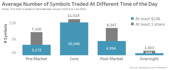 During overnight hours, the number drops further, with only 644 stocks per day seeing more than $10,000 value traded. In fact, only 1,403 stocks typically see any trades, highlighting the concentration of activity overnight.