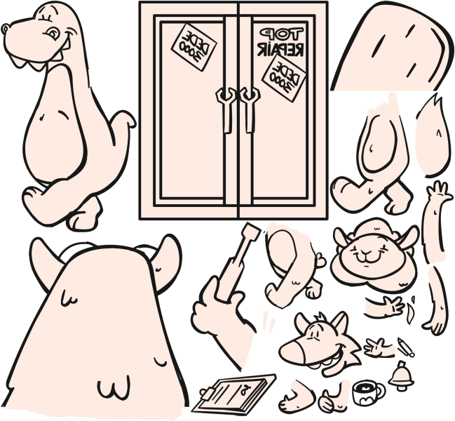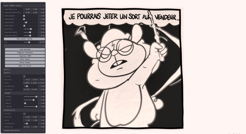 Starting from Justine’s illustrator files, every layer and visual element from each panel was exported as an individual image. These assets were then packed into optimized texture atlases using Free TexturePacker.