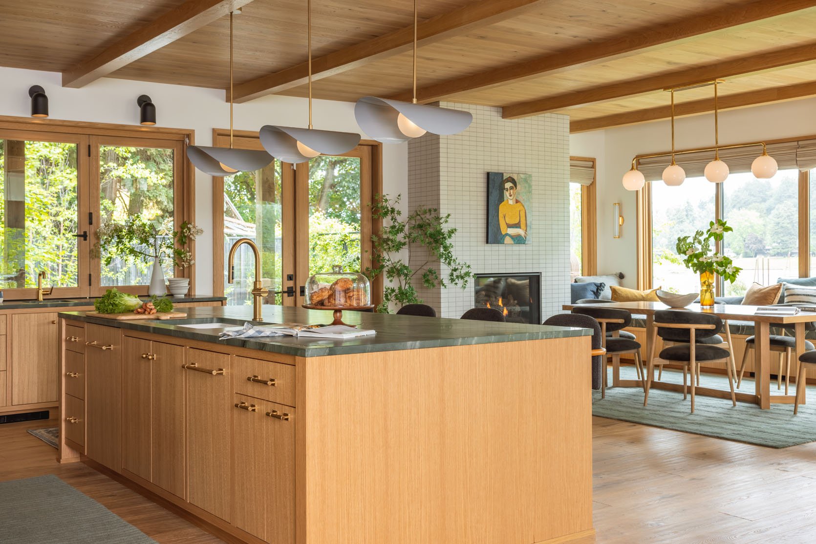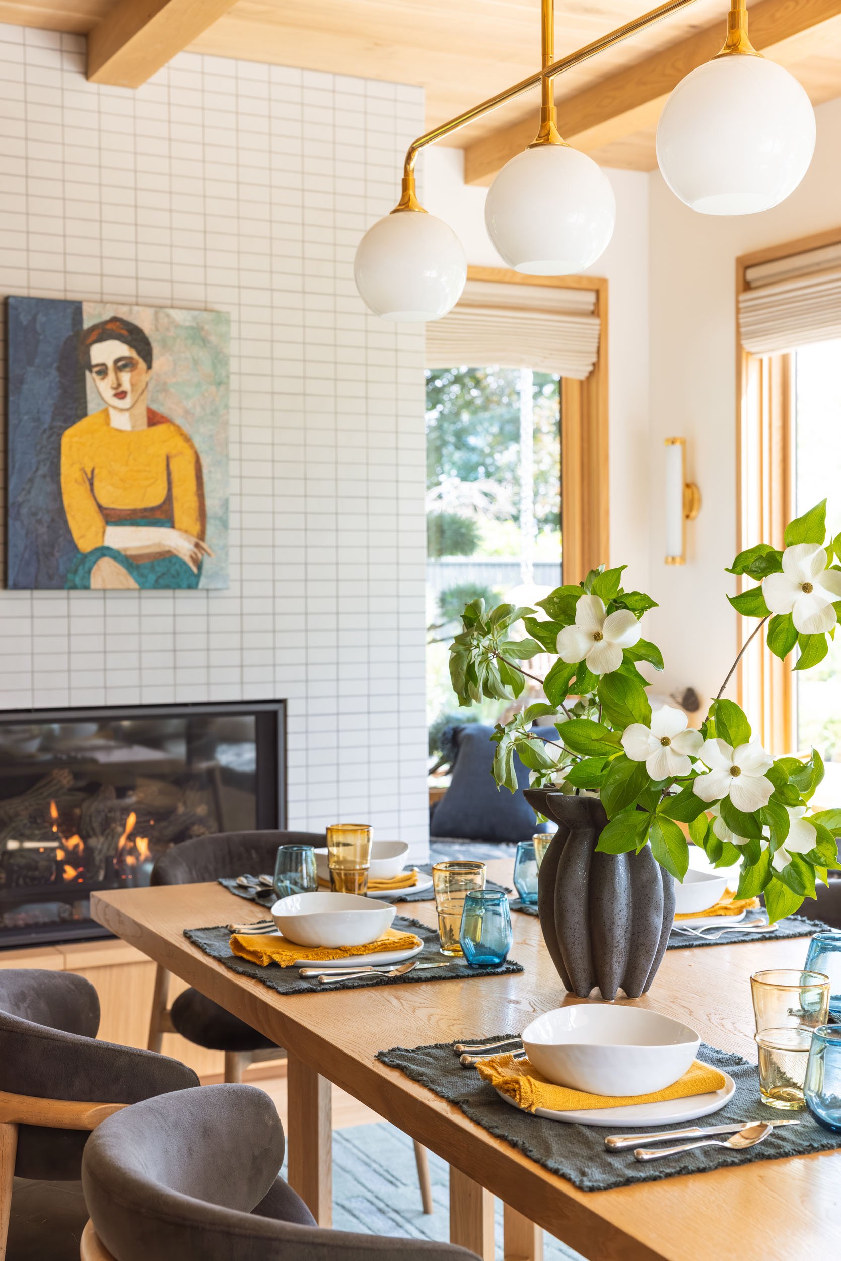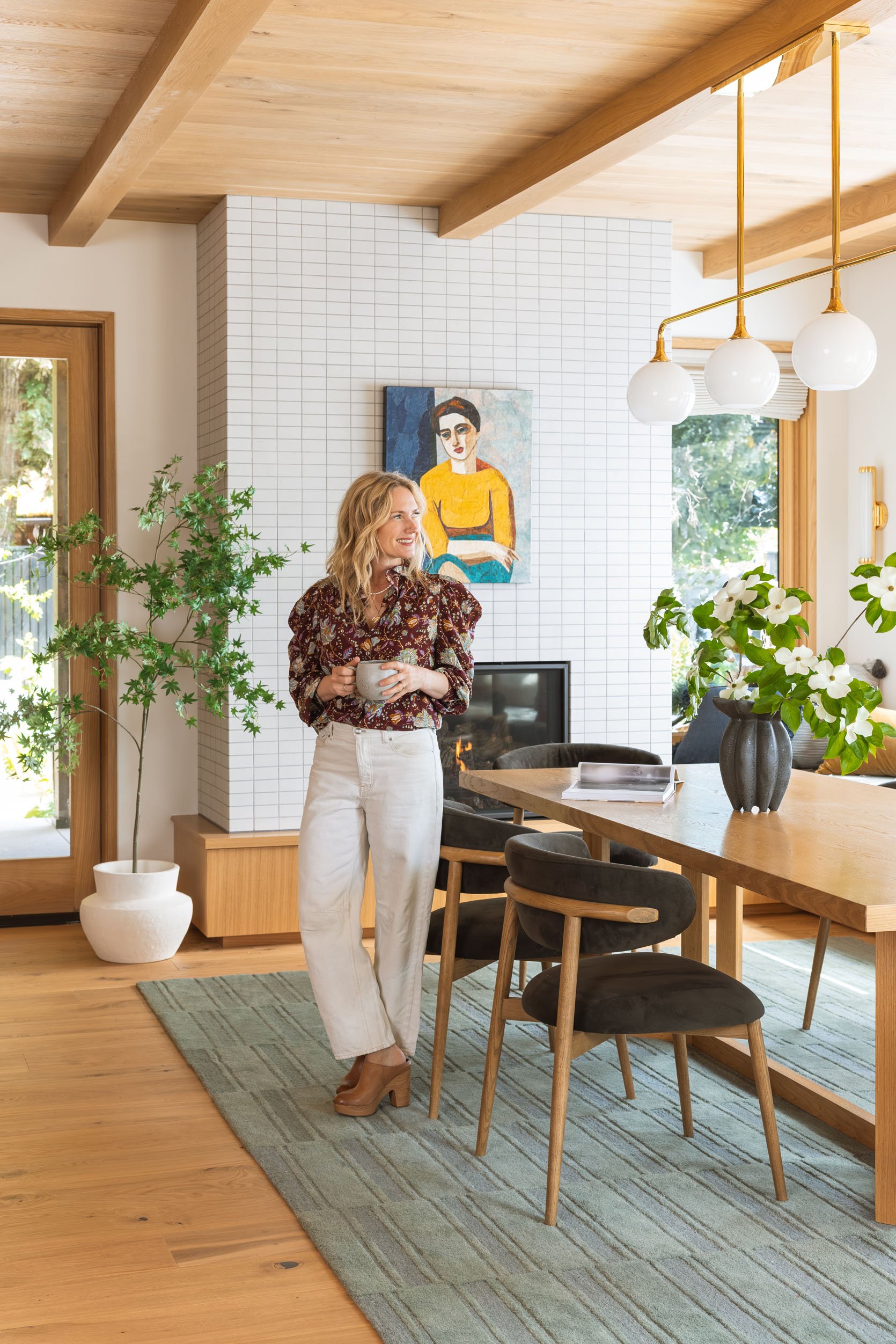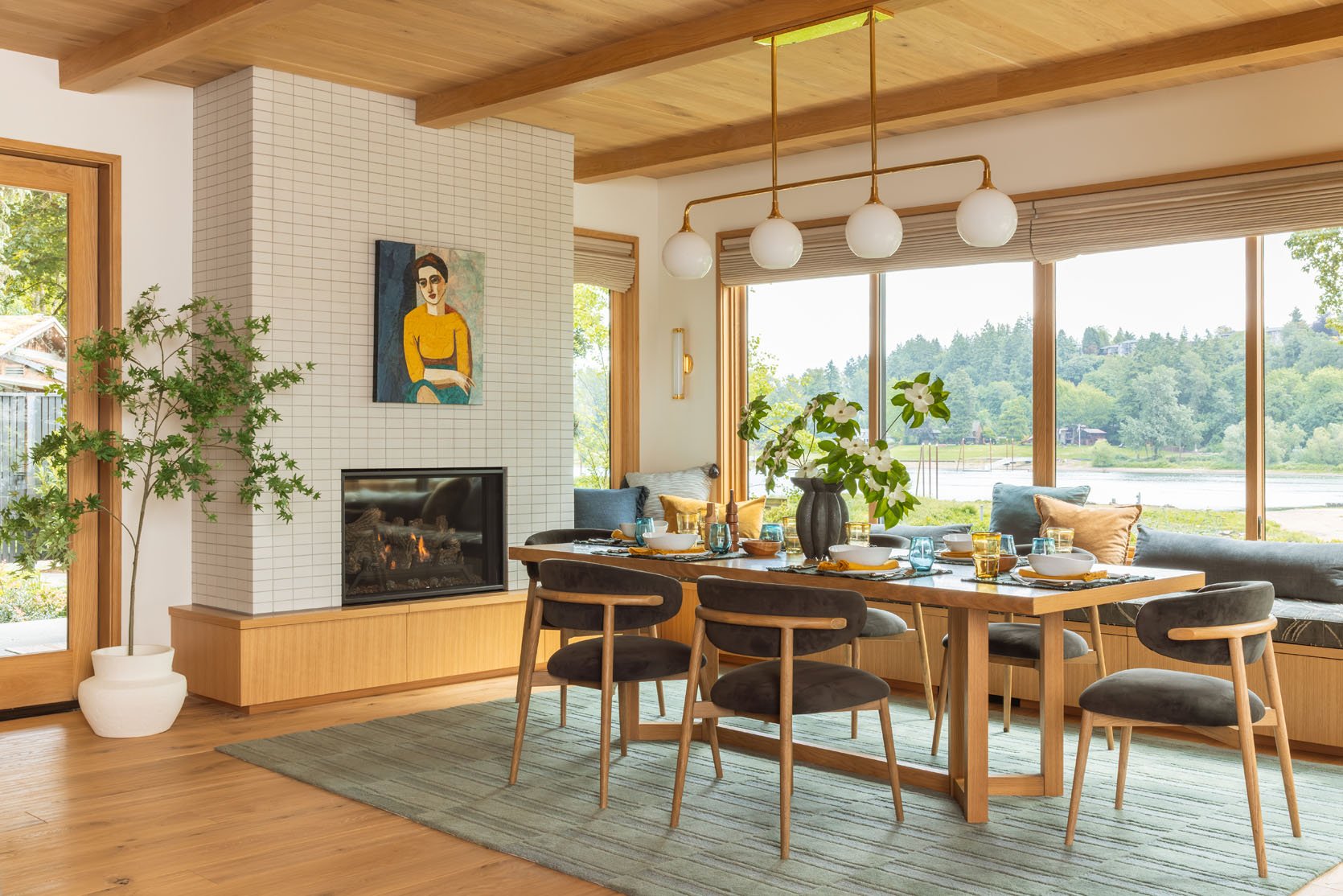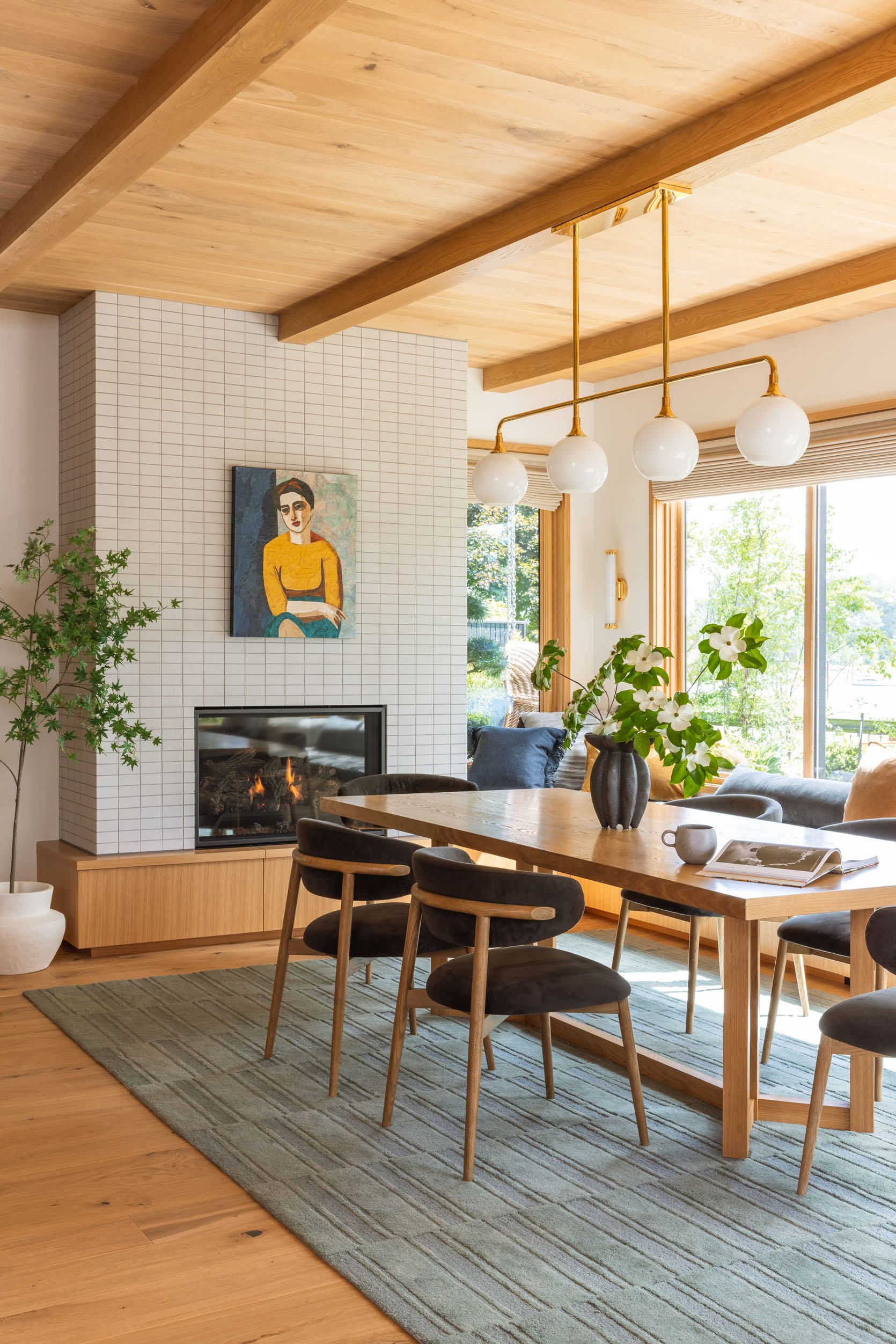 Welcome to the river house dining room reveal – such a warm and inviting landing spot with the prettiest views, a cozy fireplace, and a painting that my brother still doesn’t know if he’s into (but he hasn’t taken it down yet!!). It’s adjacent to the kitchen, with a shared color palette, and I layered it to be so warm and textural.