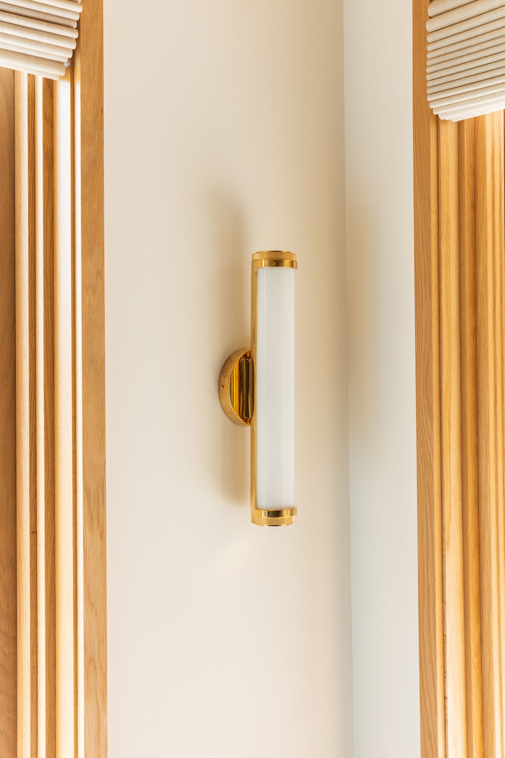 The sconces are actually vanity lights that can go horizontal or vertical, but since we had such a slim area, we thought they would look great here (and they do). Both fixtures are in the unlaquered brass, so they’ll patina a bit over time in a good way, but look pretty quiet in the room. At one point, I regretted not doing a contrasting finish (like black metal) for both, but now that the entire project is done, it really just feels simple and seamless, holistically. This look isn’t right for all styles of house, mind you (a more traditional house might want more contrast in finishes), but for this style, I love how all the finishes are simple, leaving the attention to the wood and views.