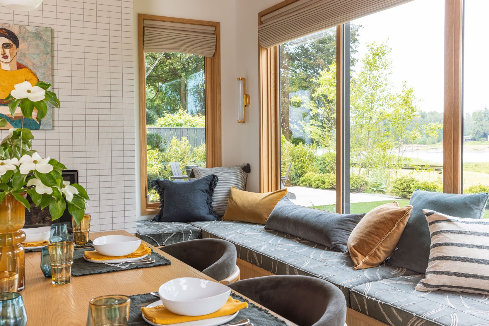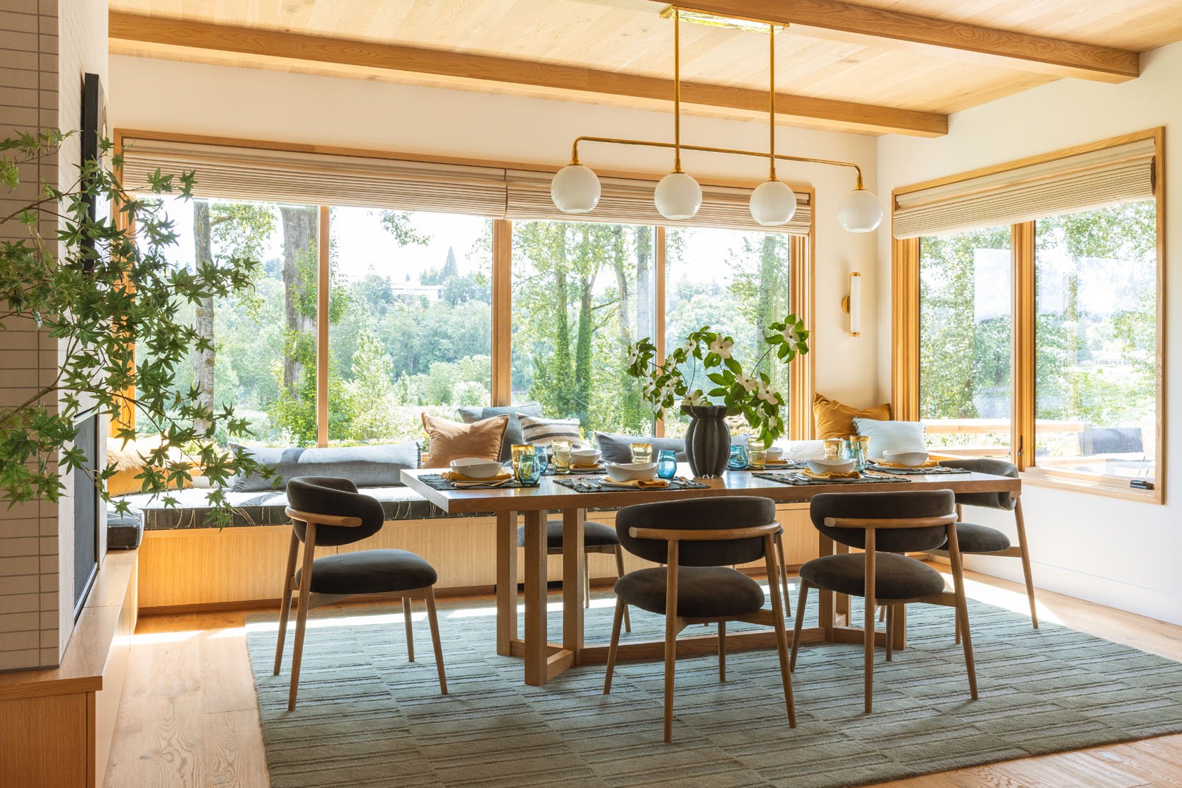 This house has a hilarious amount of bench seats. And we even nixed two upstairs. Was this one needed? Not really, but boy is it fun to sit there and stare out the window, plus for me it was an opportunity to add some color and pattern (otherwise the room would have been just wood and cream). So I was really glad that they designed them into the plan. I used this opportunity to push Pollack fabric on them – the velvets are just so beautiful in patterns that really edged up the room. Then I styled them with pretty simple pillows to add even more texture and warmth.
