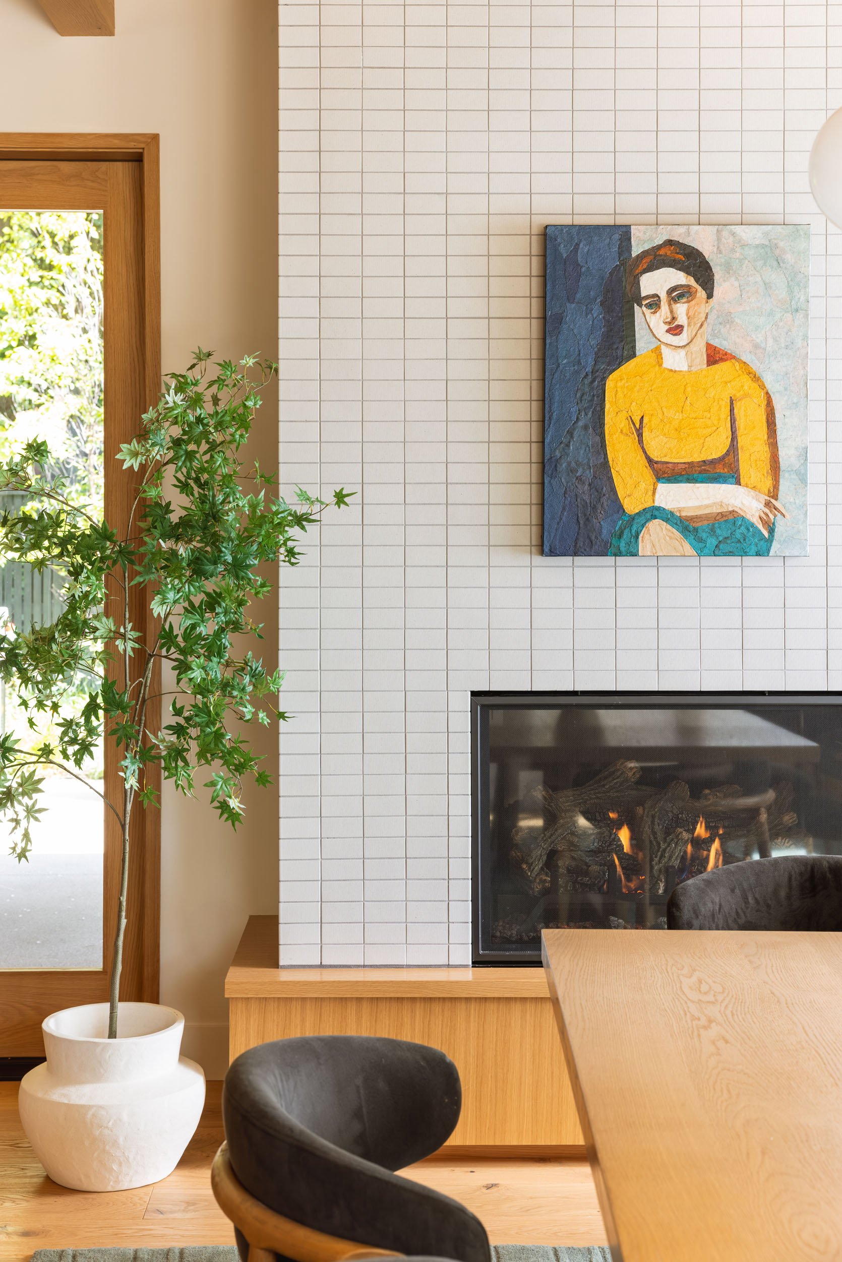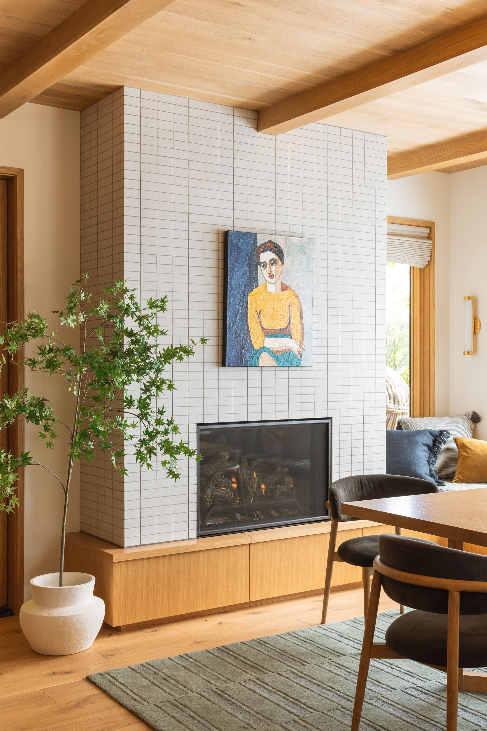 The faux tree in the corner is excellent (from West Elm!) and added a bit of softness and color on the left. The room really connects so well with the kitchen and the living room – all the finishes, colors, and textures share similarities, but it still feels customized and special.