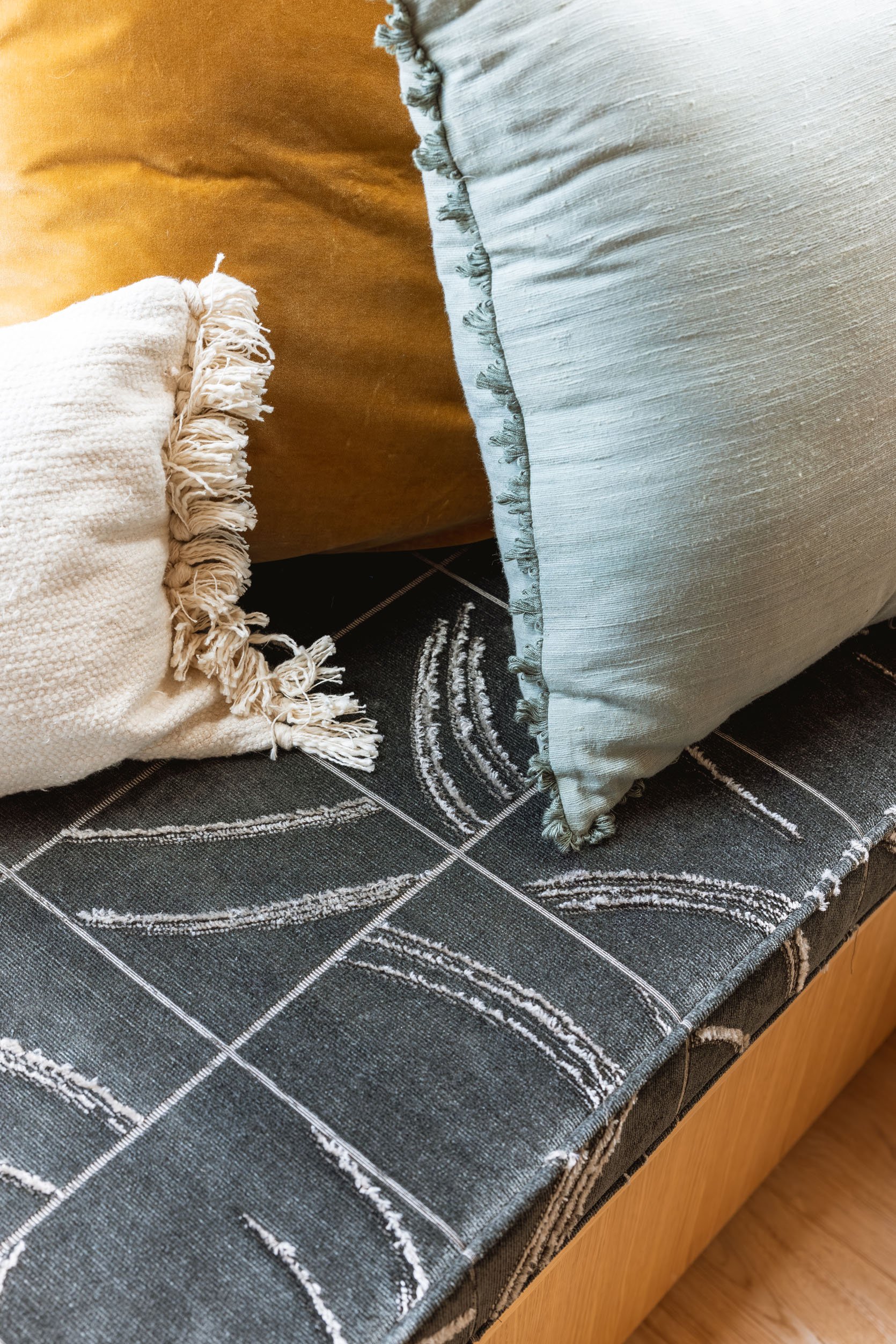 Pollack Fabric | Pillows Left to Right: Blue Fringe | Stripe Tassel (similar) | Gold Velvet | Long Lumbar (from Room Service sofa) | Gold | Blue (similar) | Big Stripe