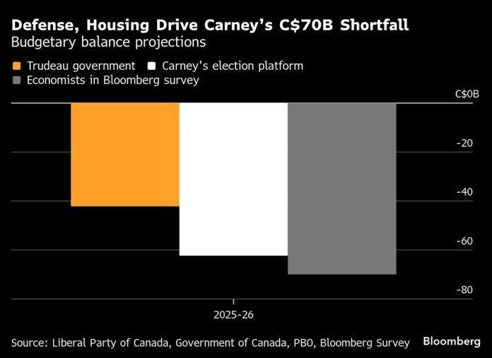 Carney has promised to grow capital spending while balancing the operating budget — effectively day-to-day government expenses — in three years. His government said Monday it will still clearly label the overall deficit, which economists in a Bloomberg survey expect will rise to about $70 billion or more than 2% of gross domestic product this fiscal year.