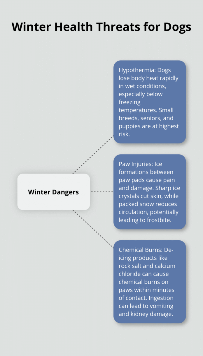 Cold weather creates three major health threats that turn routine walks into emergency situations. Dogs lose body heat rapidly in wet conditions, which makes hypothermia a real danger when temperatures drop below freezing. Small breeds, senior dogs, and puppies face the highest risk because their bodies struggle to maintain core temperature. Pets with diabetes, heart disease, kidney disease, or hormonal imbalances may have a harder time regulating their body temperature. Watch for early signs like excessive shivering, lethargy, and reluctance to move. Advanced hypothermia symptoms include muscle stiffness, shallow breathing, and loss of coordination.