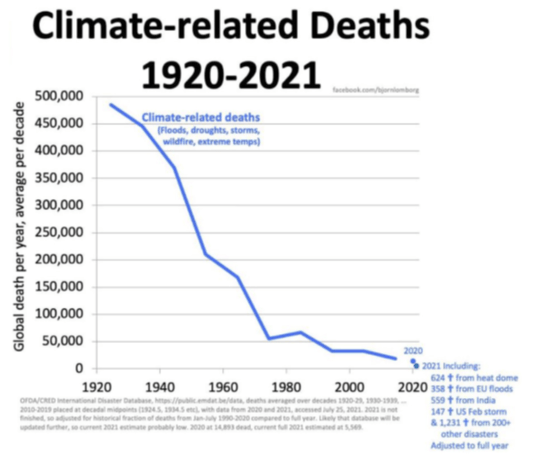 Deaths from Extreme Weather, p. 20: Real-world data show no significant increase in extreme weather over the past 100 years, and existing data show weather-related deaths down dramatically.
