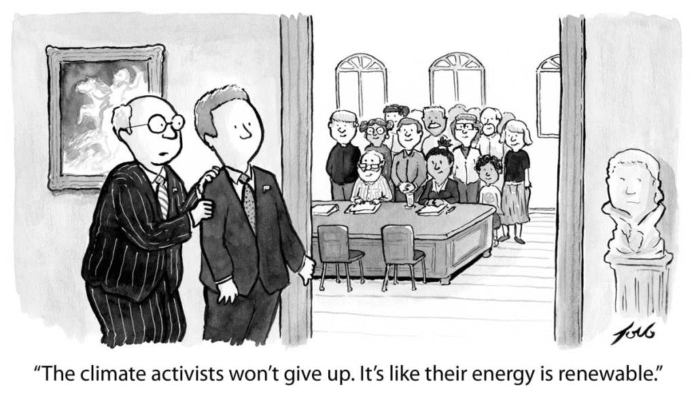 I love this one because the double entendre neatly aligns the activists’ tireless commitment with their policy goals. Clever wordplay is catnip to me. Also, it’s an optimistic cartoon about climate change, which is something of a rarity in the genre: