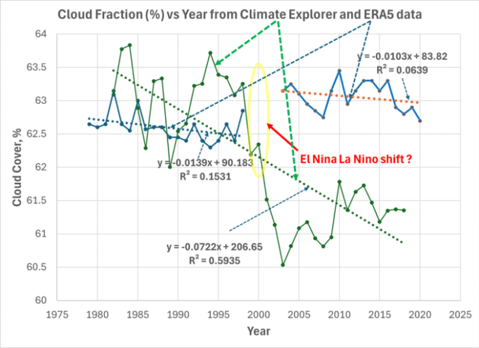Cloud data has been re-calculated by many researchers, this essay will use Climate Explorer, CE, (5) data for it’s graphs. Climate Explorer and ERA5 comparisons are shown in Figure 1. The shift in both CE and ERA5 data in about 2000 is clearly seen.