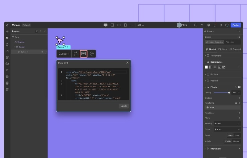 - Add a Shape element (your cursor visual) inside the Cursor div. Resize the shape element to 32×32px. You can add your preferred cursor shape by simply replacing the SVG.