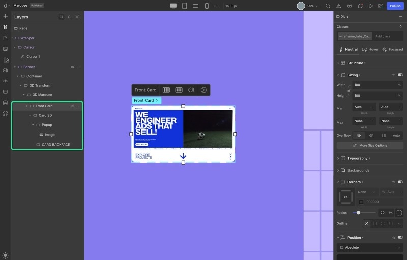 Inside Front Card, add another Div and rename it to Card-3D. This acts as a 3D wrapper so we can rotate and position the card in space without affecting its internal layout.