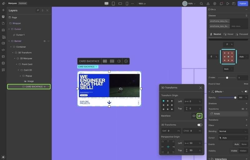 - Enable Preserve 3D: this ensures all child elements (like your cards) exist in a true 3D environment.