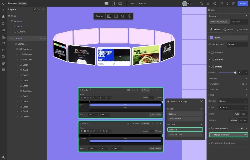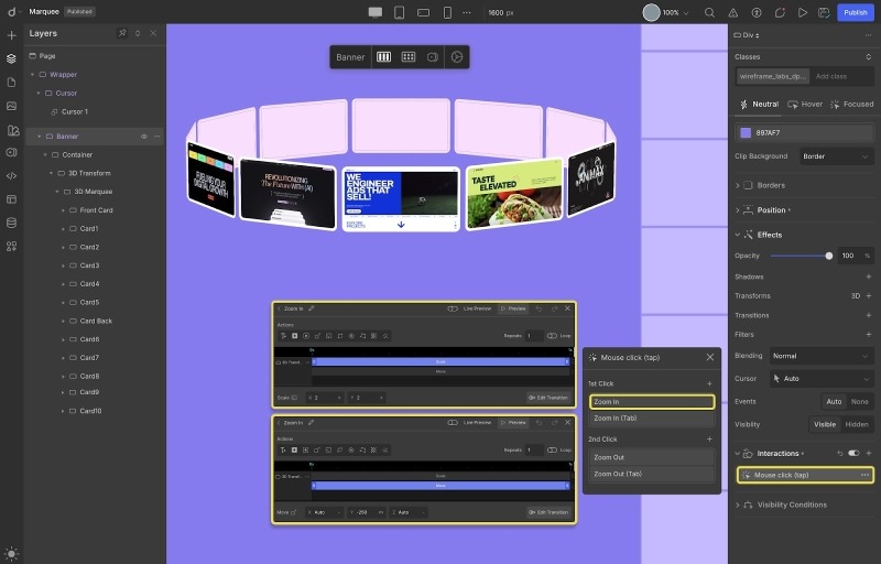 - Choose the 3D Marquee div as your animation target — this is the parent element that holds all the cards.