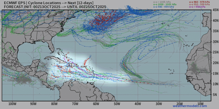 A tropical wave emerging from the west coast of Africa today is predicted to move west at 15-20 mph this week and arrive in the Lesser Antilles Islands around Monday, Oct. 20. As the disturbance approaches the islands, wind shear is predicted to be low enough to allow the wave to develop into a tropical cyclone, as predicted by the Monday morning runs of the GFS and European models and many of their ensemble members. While it’s too early to be concerned about a specific threat, the model signal is strong enough that residents of the Caribbean islands should be paying attention to future forecasts of this disturbance. As of 8 a.m. EDT Monday, NHC had not yet highlighted the wave in their Tropical Weather Outlook.