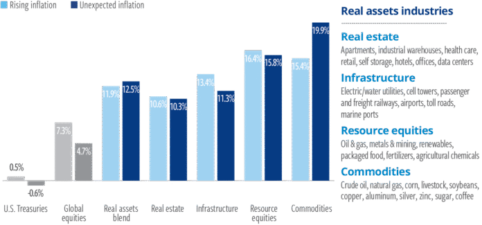 Real estate, commodities, precious metals, and infrastructure do well during periods of high inflation: