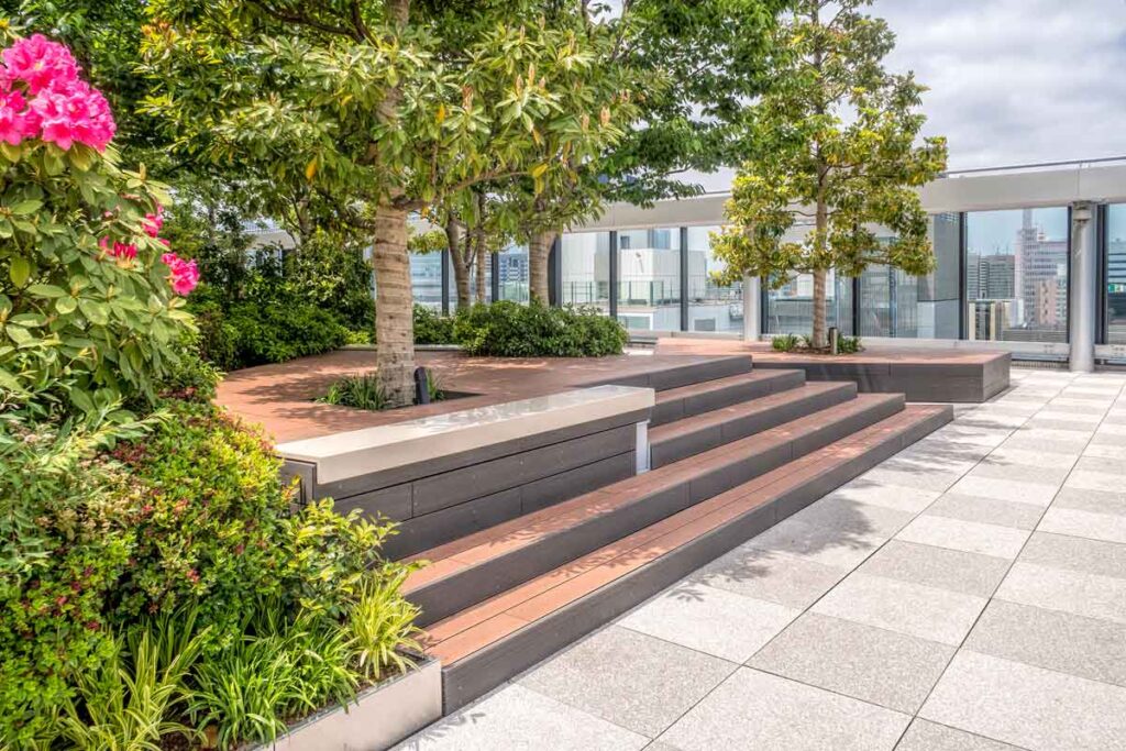 I like the terraced sides of this area, which provide plenty of extra seating and also block a lot of the city from sight, making it a very relaxing space. You can walk to the edge and look out on the city below, but it’s less of a viewing deck than some of the other Tokyo roof gardens.