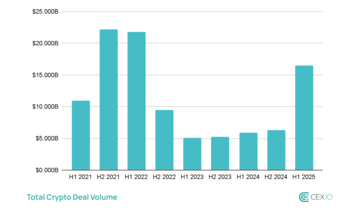 The crypto industry is regaining its deal-making momentum, with total deal volume reaching $16.5 billion in the first half of 2025. That’s already more than the $12.2 billion recorded during all of 2024, and ahead of the $10.9 billion seen in H1 2021, the industry’s most active year to date. If this pace continues, 2025 is on course to become the biggest year ever for crypto fundraising and M&A activity.