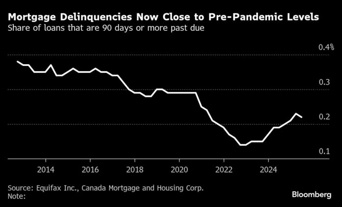 As of the second quarter, 0.22% of mortgages nationally were past due by 90 days or more, with the Toronto area at 0.24%, according to data from Equifax Inc.