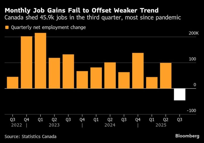 The report also reduced expectations for a rate cut at the Bank of Canada’s next decision on Oct. 29, with traders putting the odds at about 25% compared with roughly a coin flip previously.