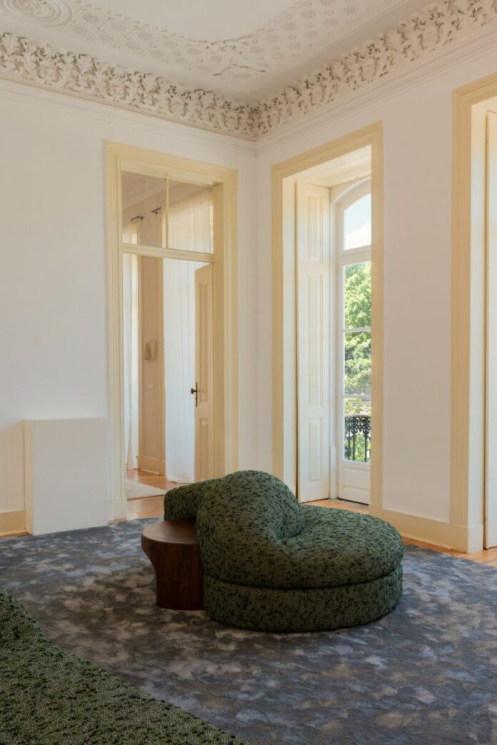 A modern room with tall windows, a high-backed wooden chair, a small green stool, a textured green lounge chair, and a patterned gray carpet