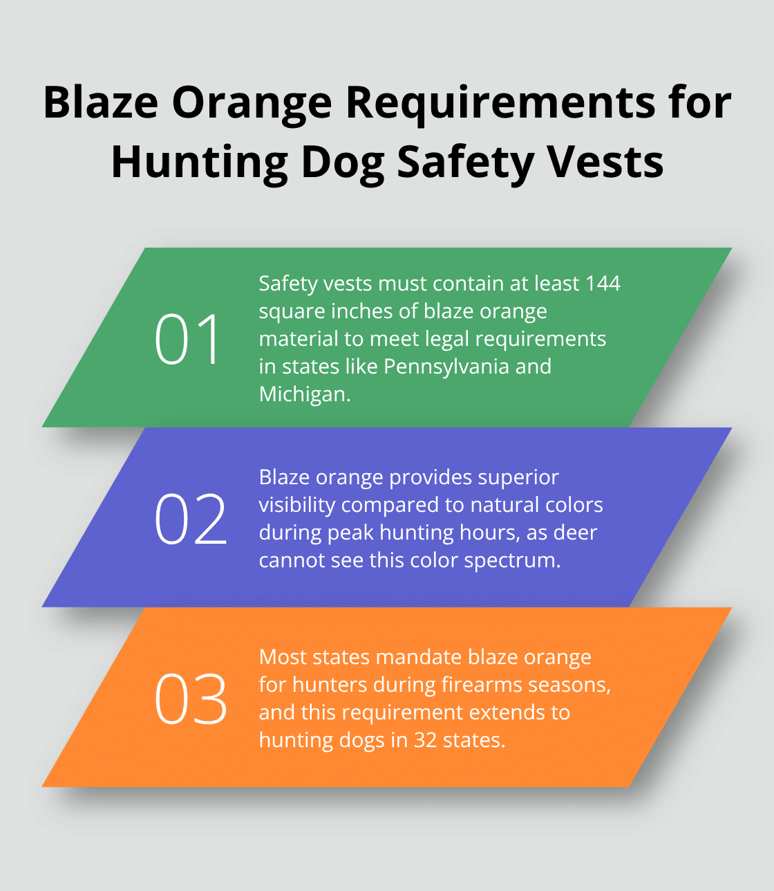 Blaze orange stands as the gold standard for hunting dog safety vests. Research confirms that blaze orange provides superior visibility compared to natural colors during peak hunting hours, as deer cannot see this color spectrum. Most states mandate blaze orange for hunters during firearms seasons, and this requirement extends to hunting dogs in 32 states.