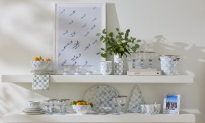 “I live near the ocean, and the blues pair nicely in a coastal home as much as a winter home,” he says. “Personally, I will be using the mugs for coffee every morning and the platters and bowls for winter hosting. I also adore the additional home decor products in the collection — the ski picture frame and the light-blue checked blanket will bring a soft touch to my living spaces.”