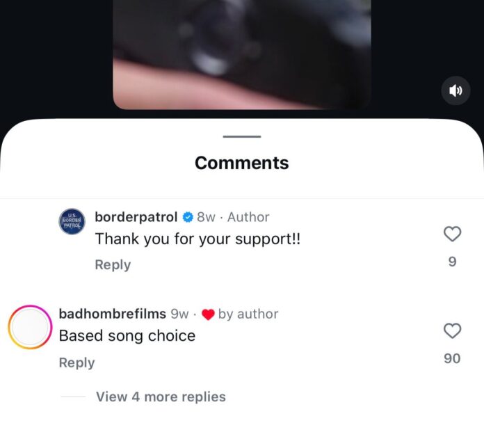 Comments on Instagram included people who clearly understood the message of the video as antisemitic. One commenter replied, “based song choice,” which was liked by the Border Patrol account. Another commenter wrote, “if you know, you know.”