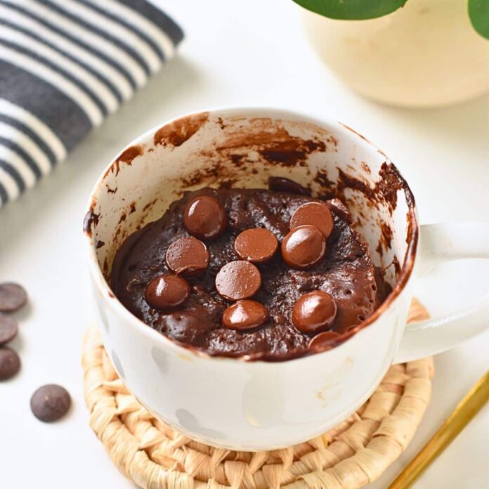 Sprinkle the remaining chocolate chips on the hot mug cake and cool for 60 seconds in the mug before eating.