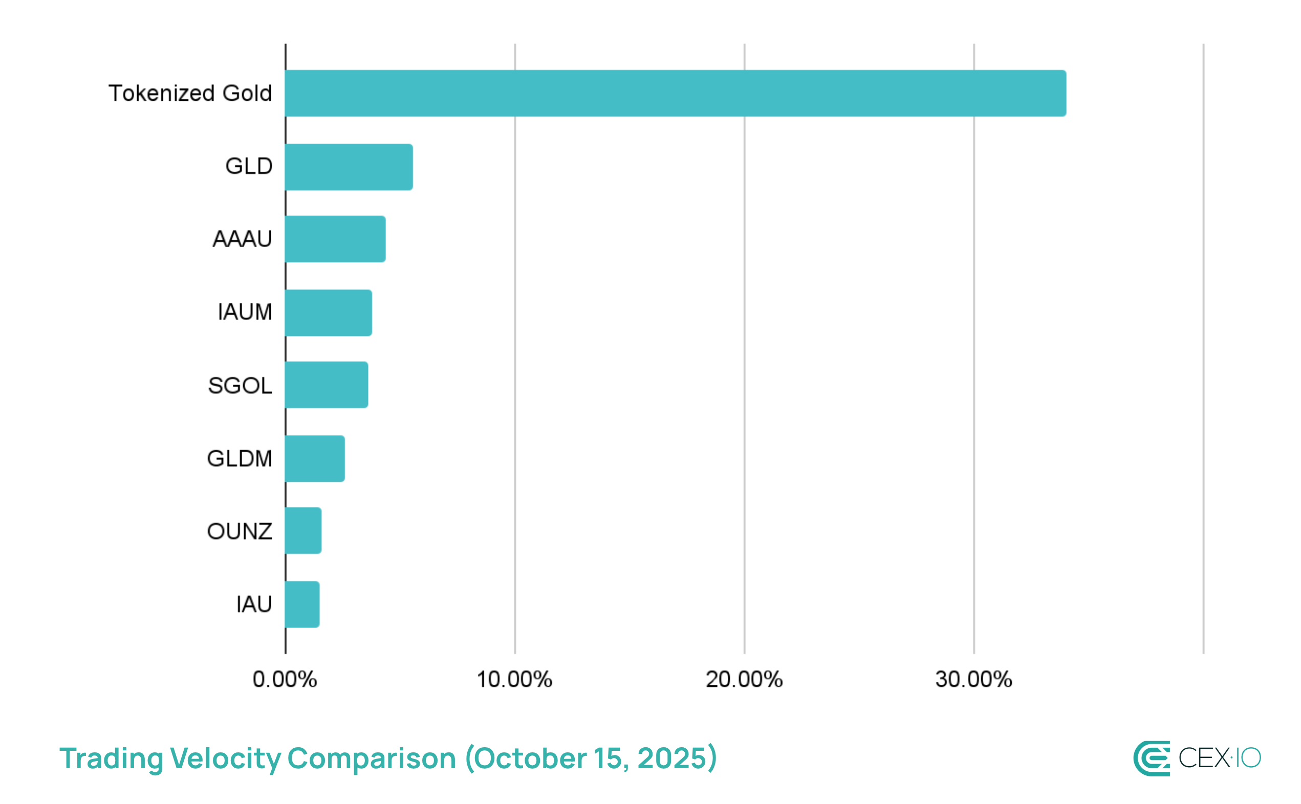 Notably, all this trading activity is taking place from a relatively small market base. While GLD and IAU have market caps of nearly $125 billion and $60 billion respectively, tokenized gold’s market cap sits just above $3 billion. Despite its smaller size, tokenized gold is trading at a velocity far higher than major ETFs and even altcoins. Current volume-to-market-cap ratios show tokenized gold at 34%, compared with GLD at 5.6% and IAU at 1.5%, highlighting how actively gold-backed cryptocurrencies are bought and sold relative to its size.