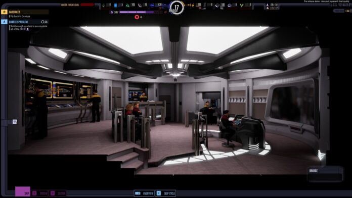 I deliberately neglected managing the ship outside of the bare minimum power and deuterium resources needed to keep the ship going—not assigning senior staff to workstations, nosediving the crew’s morale by denying them more than emergency rations in the mess hall, or not building even emergency rest quarters (but not too far—not having enough fuel to have the warp core running outside of “Grey mode” or lowering morale to a certain point leads to an instant fail state). Whenever I could, I would make an aggressive decision, seeing how much I could break myself away from the events of “Caretaker.”