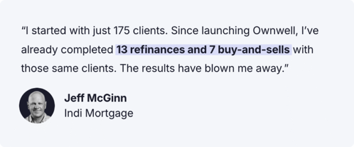 - Jeff McGinn, Indi Mortgage: “Since launching Ownwell in August 2024, I’ve been blown away by the results. I started with a relatively small book of clients (just 175 clients who had purchased in the last five years). Fast forward to today, and we’ve already completed 13 refinances/transfers and 7 sell-and-buy transactions with those same clients.”