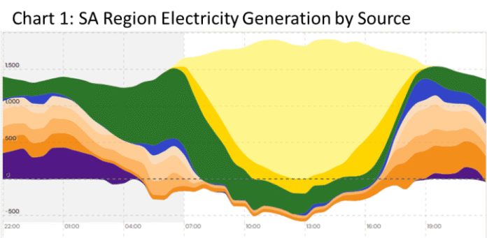 Some finer points of the chart that should be noticed is the dotted line that indicates zero on the scale.  SA is able to import and export to Victoria.  So when the internal generation exceeds the internal demand the export is shown as a negative value on the chart.  It is apparent that on this day, rooftop solar was supplying the entire internal demand of the State around midday.  Utility scale WDGs were able to produce some output by exporting.  The purple region above the dotted line indicates imported generation.