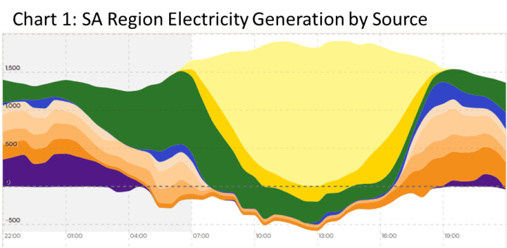 Australia is unique amongst G20 nations in having the best solar resource combined with mostly mild winters and warm to hot summers.  This means sunlight is truly ubiquitous all year over the mainland States while the high population centres do not experience snowfall.  SA is well placed to make use of the solar resource as indicated in Chart 1, which is taken from OpenNem for a 24 hour period ending 10pm 15 October 2025 where the bright yellow bathtub shape is the rooftop solar component and the darker yellow is the utility scale solar.