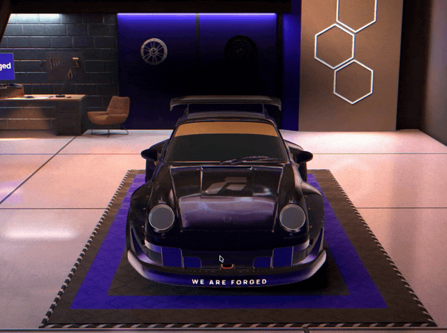The visual language came straight from the real world. Think Han’s garage from Tokyo Drift for vibe intersecting with clean-meets-industrial aesthetic of Singer or Gunther Werks. The Forged space borrows that same balance of polish and grit: concrete floors, metal shelving, soft reflections on paint and glass.