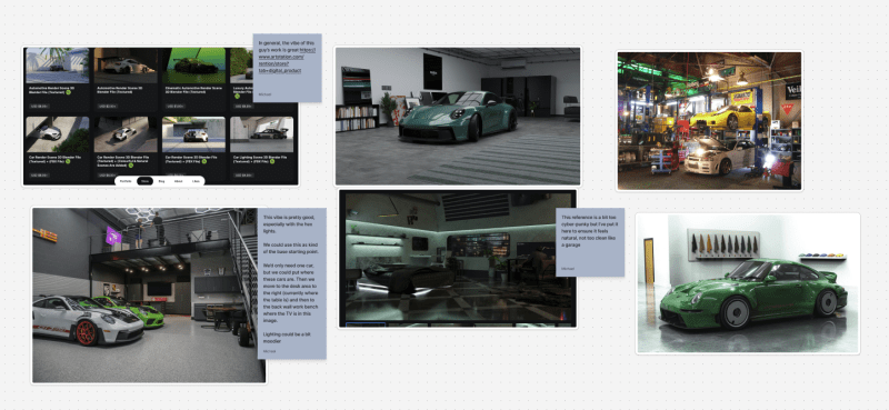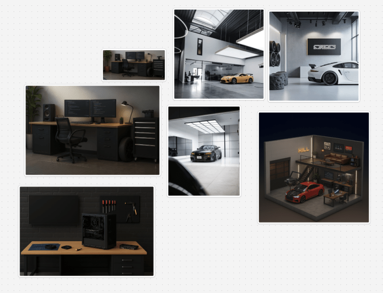 Early on, I mocked up concepts using AI image generation — not as final art, but as a fast way to show what was in my head: the garage exterior, the door rolling open, the contrast between rough and refined. That shortcut let us iterate visually before a single polygon was modeled.