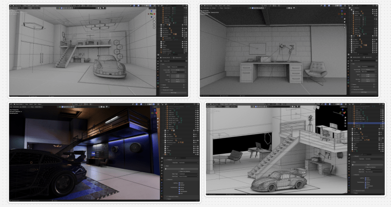 From there, we built the full environment in Blender, modeling each element, dressing the scene with props, and baking lighting passes to capture realistic falloff and shadow. The challenge was to make everything feel cohesive with multiple rooms forming one continuous workshop, all illuminated as if they belonged to the same physical space.