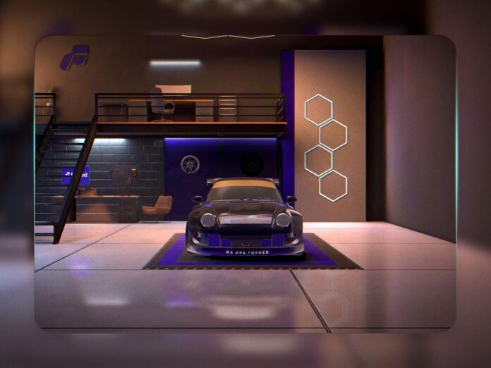The visual language came straight from the real world. Think Han’s garage from Tokyo Drift for vibe intersecting with clean-meets-industrial aesthetic of Singer or Gunther Werks. The Forged space borrows that same balance of polish and grit: concrete floors, metal shelving, soft reflections on paint and glass.