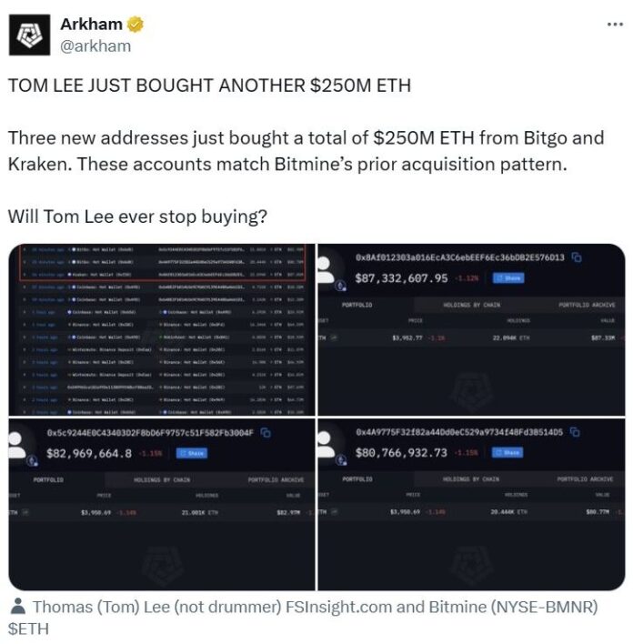 BitMine bought up another $250 million Ether (ETH) on Monday from crypto exchanges Bitgo and Kraken, according to blockchain analytics platform Arkham Intelligence.