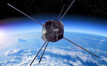 Artist’s impression of the Vanguard 1 satellite, in orbit, with Earth below it.