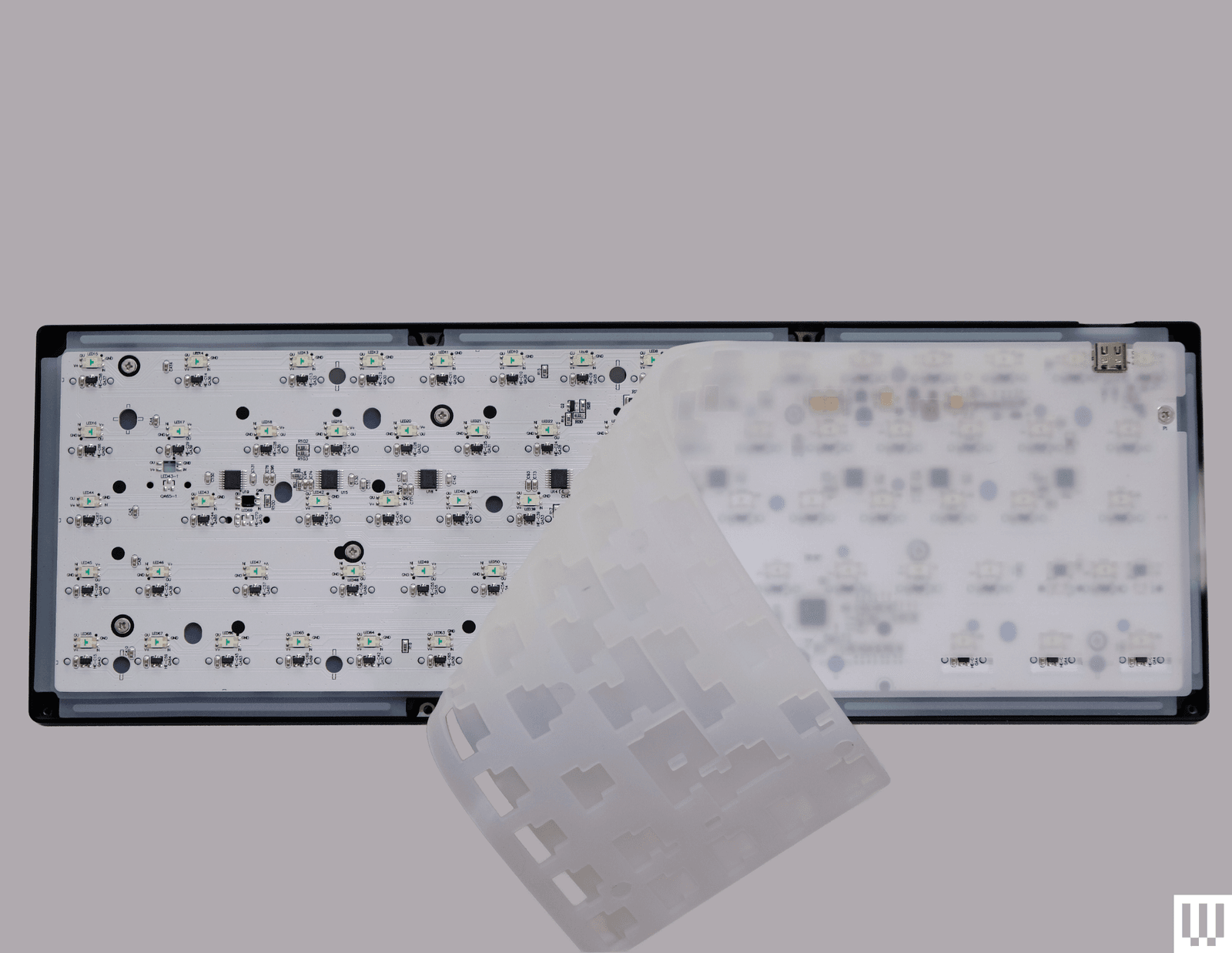 The internal assembly is rather simple: The printed circuit board (PCB) and switch plate are screwed together, sandwiching a sheet of silicone between them. This silicone fills the empty space between the plate and PCB, and extends past on the outside edge to create gaskets that the two halves of the case hold in place. With this, the internal assembly is held in place without making direct contact with the outside case, reducing vibration and excess noise.
